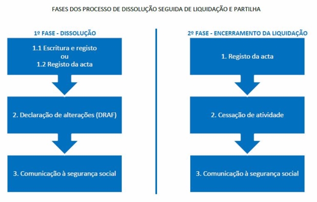 Após reunir toda a documentação necessária, é feito o agendamento no Cartório para a realização da escritura de dissolução na qual têm de estar presentes todos os sócios ou seus representantes legais. Após a realização da escritura segue-se a requisição do registo da dissolução no Gabinete de Apoio ao Registo Comercial que deverá ser efetuado num prazo máximo de 2 meses a contar da data da escritura com os seguintes elementos: